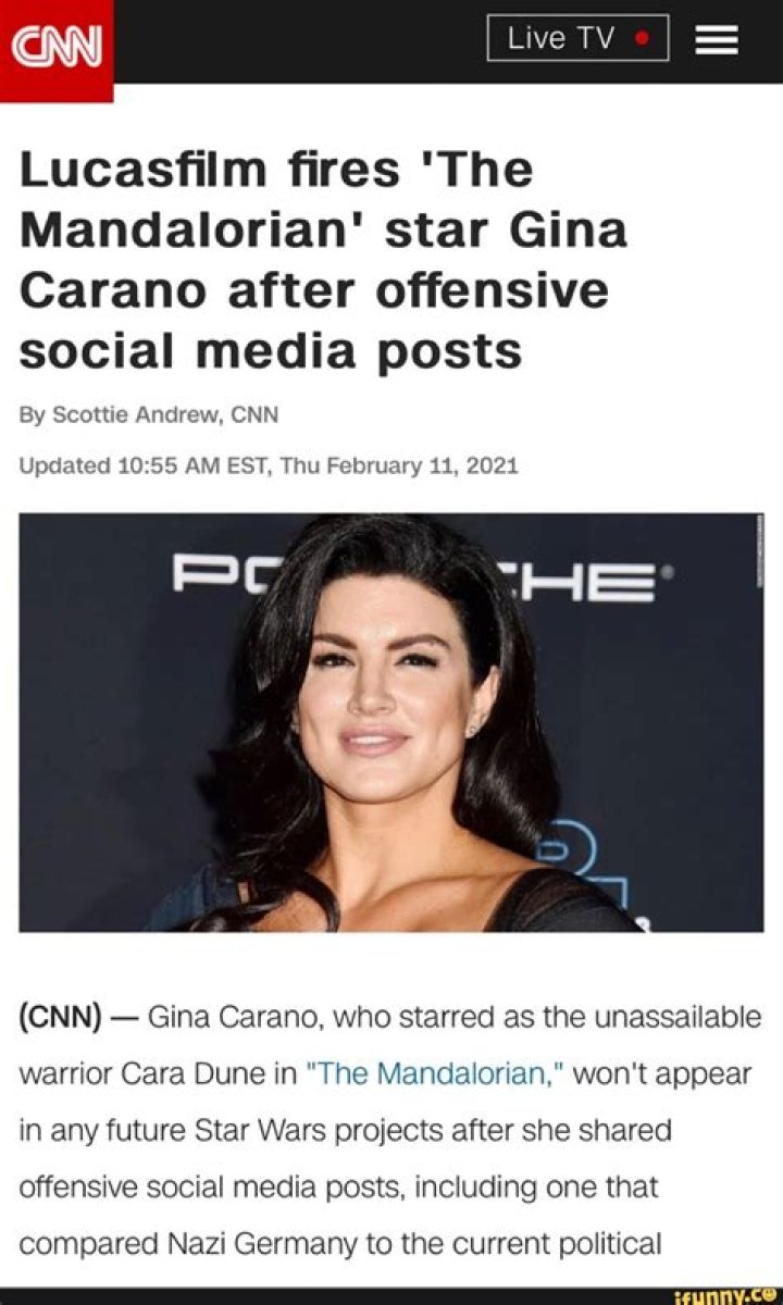 FAQs about "mandalorian star gina carano fired over offensive social media posts"