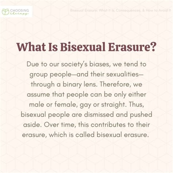Bi erasure is the tendency to overlook or downplay the existence and experiences of bisexual people. It can manifest in a variety of ways, including:Ignoring or dismissing bisexual people's experiences as being "not real" or "just a phase."Assuming that bisexual people are actually gay or lesbian, or that they are "confused" about their sexual orientation.Making jokes or other dismissive remarks about bisexual people.Bi erasure can be harmful to bisexual people, as it can make them feel invisible and invalidated. It can also lead to discrimination and prejudice against bisexual people.