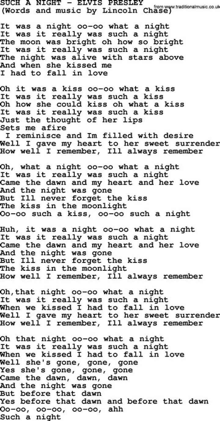 - Lyrical Simplicity and Emotional Depth: The lyrics of "Such a Night" are deceptively simple yet profoundly evocative. They capture the essence of falling deeply in love, with lines like "I've never known a love like this before" and "You're everything I've ever dreamed of."- Timeless Appeal: The song's themes of love, longing, and enchantment resonate with people of all ages and backgrounds, making it a truly timeless classic.- Presley's Vocal Performance: Presley's smooth and passionate vocals bring the lyrics to life, adding an emotional depth that elevates the song beyond mere words.Discussion