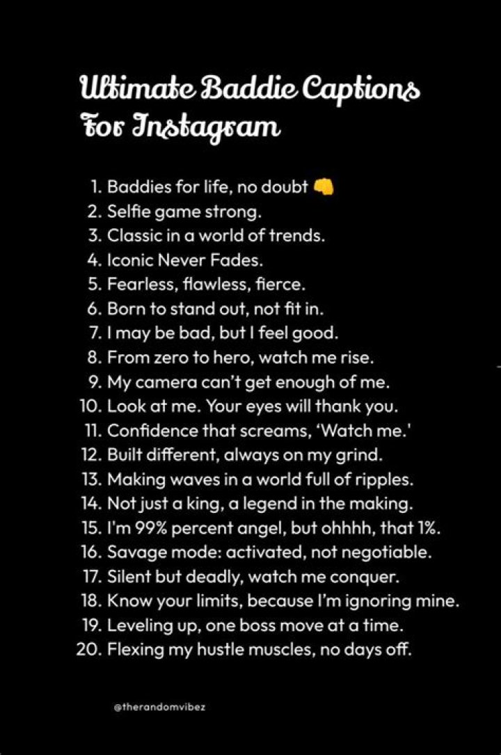 - Confident: Baddie Instagram captions often express the poster's confidence in their own appearance and style.